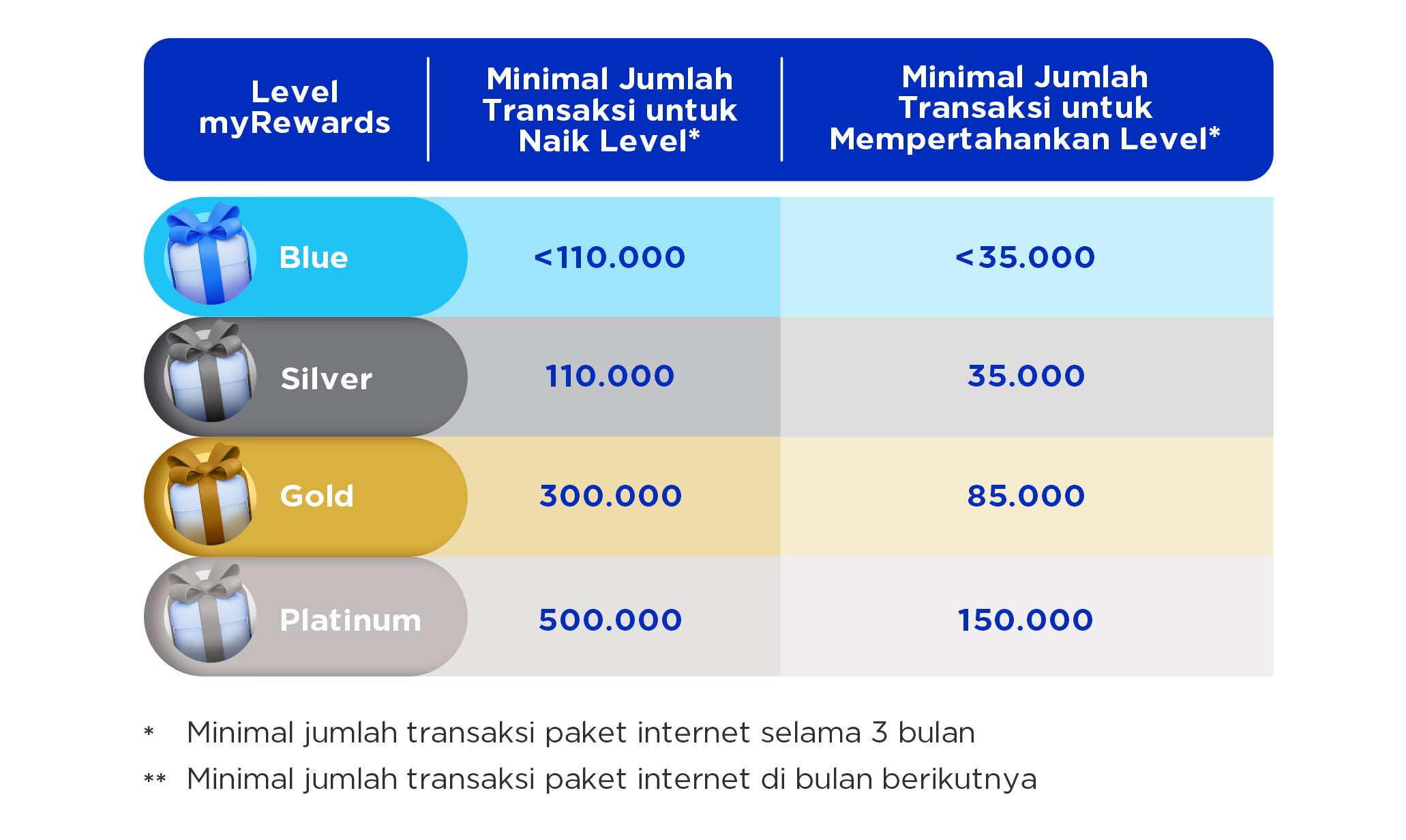 A: Setelah ada kenaikan level myRewards, maka level yang baru akan dipertahankan sampai akhir bulan berikutnya (M+1). Selanjutnya, untuk tetap dapat berada di level yang sama di bulan selanjutnya (M+2), pengguna harus memenuhi minimal jumlah transaksi paket internet yang sudah ditentukan di bulan sebelumnya (M-1).